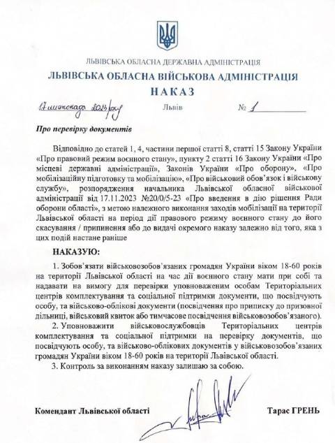 Вчора, 20 листопада, керівник апарату Львівської ОВА Тарас Грень підписав наказ "Про перевірку документів", згідно з яким вводиться в дію рішення Ради оборони Львівської області від 17 листопада щодо перевірки документів в усіх військовозобов’язаних чоловіків на території Львівської області.