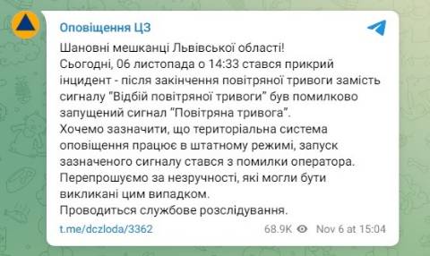 Сьогодні, 6 листопада, о 14:09 год на території Львівської області оголосили повітряну тривогу, яка закінчилася о 14:33 год. Однак замість відбою тривоги помилково прозвучав сигнал повітряної тривоги.
