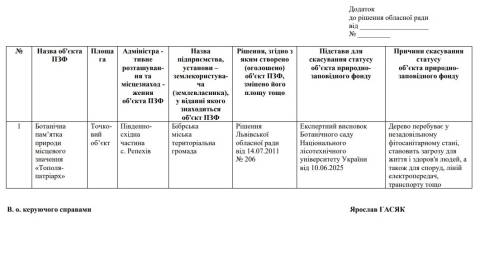Комісія з питань з питань екології, природних ресурсів Львівської обласної ради 19 червня цього року зареєструвала проєкт рішення про скасування статусу природно-заповідного фонду – ботанічної пам’ятки "Тополя-патріарх" у селі Репехів Бібрської громади Львівського району.