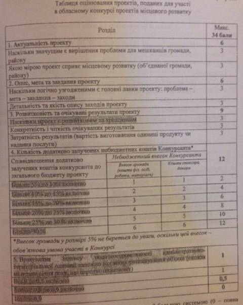 Зокрема, депутати розробили таблицю оцінювання мікропроектів, які подали на конкурс: оцінка кожного критерію проводиться за 3-бальною системою (0 – повна невідповідність/відсутність відповідної інформації, 3 – максимальна відповідність).