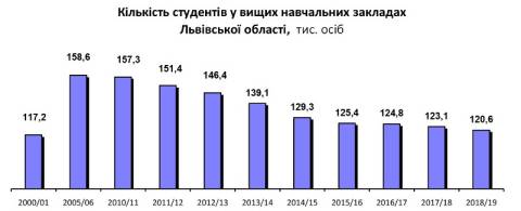 Щодо студентів, які навчаються у ВНЗ Львівщини, то їх кількість скорочується: у цьому навчальному році вищу освіту здобувають 120,6 тисяч студентів, що на 2,1% менше, порівняно з попереднім навчальним роком, та на 24% – порівняно з 2005-2006 навчальним роком.