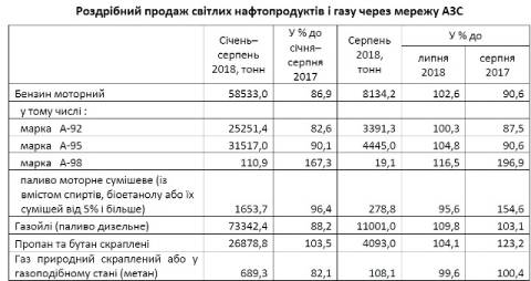 Зокрема, дизельного палива продали 73,3 тис.т, що на 11,8% менше, ніж у січні-серпні 2017 року, бензину – 58,5 тис.т (на 13,1% менше), пропану і бутану скраплених – 26,9 тис.т (на 3,5% більше).