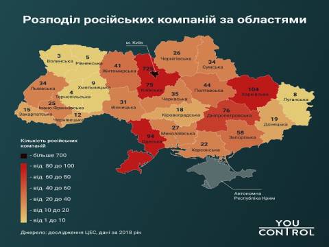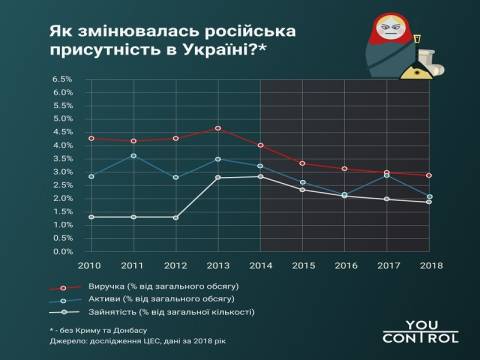 Дослідження Центру економічної стратегії на основі бази даних Orbis щодо російської економічної присутності в Україні показує, що якщо враховувати справжніх, а не номінальних бенефіціарів, у 2018 році в Україні працювало 1 553 компанії з російськими бенефіціарами з часткою власності більше за 25%. Варто зауважити, що враховувались лише ті компанії, в доступній фінансова звітність. Їх загальний обсяг активів становив 8,7 млрд доларів – це близько 2% від активів усіх українських компаній, виторг – 8,8 млрд доларів ‒3% від усіх українських компаній. В російських компаніях працювало 102 тисячі українців, що становить близько 2% від усіх найманих працівників в Україні.