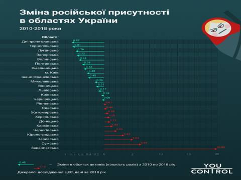 Рисунок 3 показує, що за останні 10 років російська присутність на Західній Україні впала (окрім Закарпатської області), а зросла найбільше в Закарпатській, Сумській, Черкаській, Кіровоградській та Чернігівській областях. Але це не обов’язково свідчить про систематичне збільшення російської присутності: наприклад, в Закарпатській та Черкаській областях ключовим чинником було придбання російською компанією місцевого обленерго.