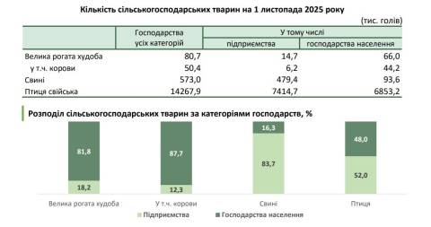 Кількість великої рогатої худоби у господарствах усіх категорій станом на 1 листопада становила 80,7 тис. голів (у тому числі корів – 50,4 тис. голів), свиней – 573 тис. голів, птиці свійської – 14,3 млн голів.Г