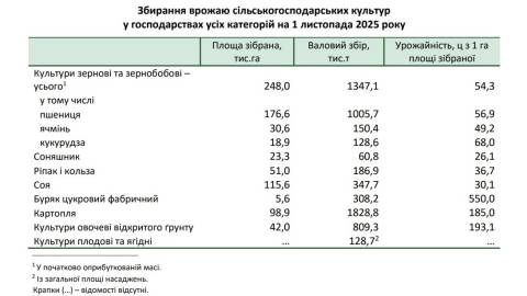Станом на 1 листопада цього року господарства усіх категорій зібрали культури зернові та зернобобові з площі 248 тис.га (75,1% від їх посівної площі), у тому числі кукурудзу – 18,9 тис. га (18,8%), ріпак і кользу – 51 тис. га (99,9%), сою – 115,6 тис. га (75,6%), соняшник – 23,3 тис. га (91,3%), буряк цукровий фабричний – 5,6 тис. га (35,6%), картоплю – 98,9 тис. га (99,5%), культури овочеві відкритого ґрунту – 42 тис. га (96%).