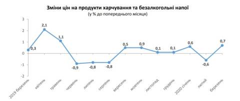 У березні, порівняно з лютим, ціни на продукти харчування та безалкогольні напої зросли на 0,7%.