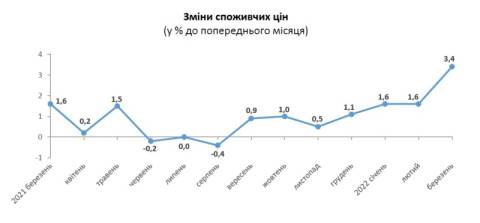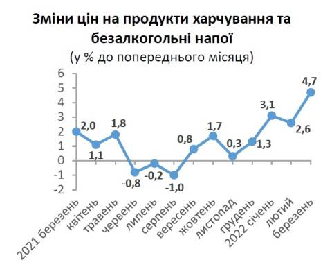 У березні, у порівнянні з лютим, ціни на продукти харчування та безалкогольні напої зросли на 4,7%.