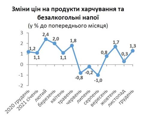 У грудні 2021 року, порівняно з листопадом, ціни на продукти харчування та безалкогольні напої зросли на 0,3%.