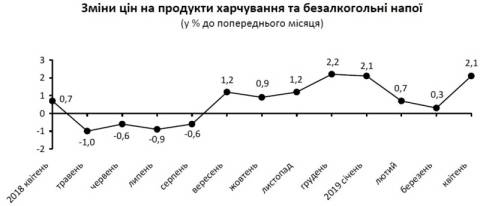 У квітні, порівняно з березнем, ціни на продукти харчування та безалкогольні напої зросли на 2,1%.