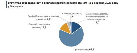 На початок березня цього року дві третини заборгованості припало на промислові підприємства (61,8 млн грн), 15% – на підприємства сільського, лісового та рибногогосподарств (13,9 млн грн), 12,8% – на організації, які здійснюють операції з нерухомим майном (11,9 млн грн), 4,2% – на організації, які здійснюють професійну, наукову татехнічну діяльність (3,9 млн грн).