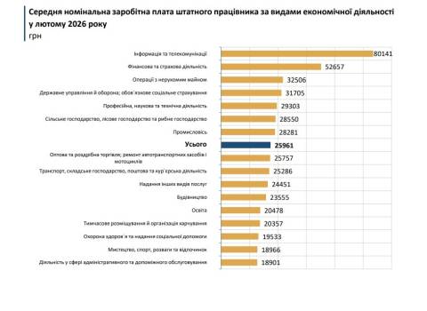 Найбільш оплачуваними у лютому були працівники підприємств та організацій інформації та комунікацій (80 141 грн), фінансової та страхової діяльності (52 657 грн), операцій з нерухомим майном (32 506 грн), державного управління й оборони, обов’язкового соціального страхування (31 705 грн).