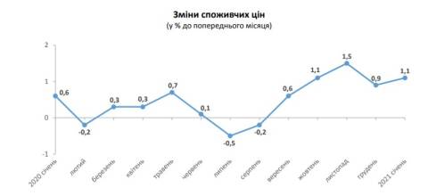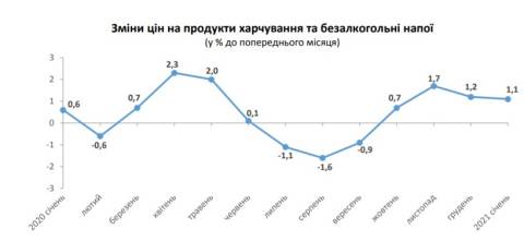 У січні, порівняно з груднем, ціни на продукти харчування та безалкогольні напої підвищились на 1,1%.