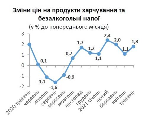 У травні, порівняно з квітнем, ціни на продукти харчування та безалкогольні напої підвищились на 1,8%.