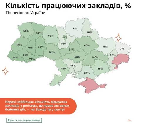 Станом на 19 березня в Україні працює 38% кафе та ресторанів, найбільшу кількість відкритих закладів зафіксували у регіонах у Закарпатській області – 84%, у Чернівецькій – 77%, у Тернопільській – 73%, у Хмельницькій – 75%, в Івано-Франківській – 72%, у Львівській – 69%.