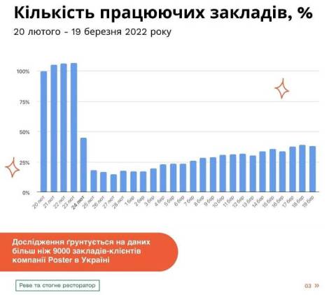"Наприкінці лютого у країні працювало лише 14% закладів у порівнянні з довоєнним показником 20 лютого. З початку березня тенденція змінюється: ресторатори потрохи повертаються до роботи навіть попри воєнний стан" – повідомили у компанії Poster.
