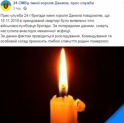 Вчора, 18 листопада, в орендованій квартирі у Яворові виявили тіло військовослужбовця 24-ї окремої механізованої бригади ім. Короля Данила.