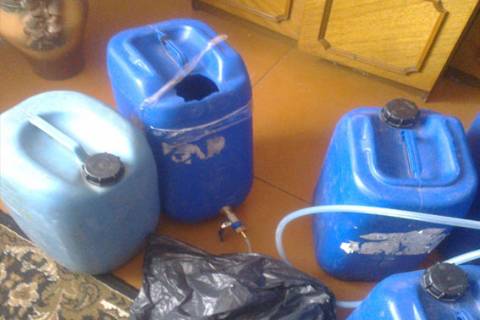 Майже 500 літрів етилового спирту, 20 пляшок фальсифікованої під відомий бренд горілки, акцизні марки та більше ста пляшок для розливу горілчаної продукції – все це знайшли та вилучили правоохоронці при обшуку міні-цеху.