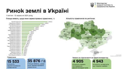 Станом на 12 вересня в Україні у рамках ринку землі укладено 15 533 угоди, лідерами за площею земель, щодо яких зареєстровано правочини, є Кіровоградська (4930,9 га), Харківська (4236 га) та Полтавська (3599,5 га) області.