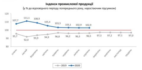 У січні-серпні, порівняно з цими місяцями 2019 року, виробництво промислової продукції в області збільшилось на 2,9%.