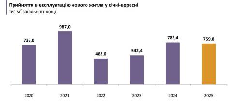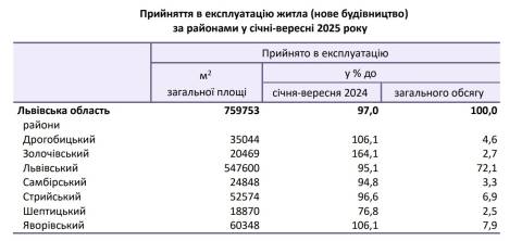 У січні-вересні цього року у Львівській області прийняли в експлуатацію 759,8 тисячі м² загальної площі нового житла, що на 3% менше, ніж за ці місяці минулого року.