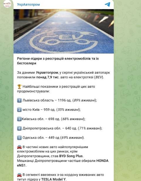 Найпопулярнішим електромобілем на ринках Львівської області став BYD Song Plus. У сегменті ввезених з-за кордону вживаних авто лідером стала Tesla Model Y.
