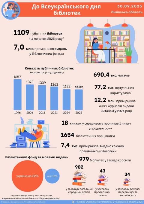 Минулого року у Львівській області діяло 1109 публічних бібліотек, що на 53 менше, порівняно з 2021 роком, й на 13 менше, порівняно з 2023 роком. Натомість за останні два десятиліття мережа бібліотек в області скоротилася майже на п’яту частину (20,4%).