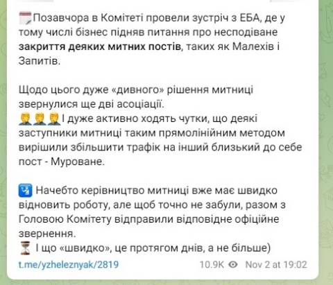 "В Комітеті провели зустріч з ЕБА, де у тому числі бізнес підняв питання про несподіване закриття деяких митних постів, таких як Малехів і Запитів.