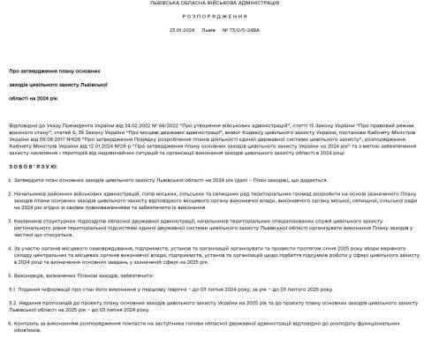 "З метою забезпечення захисту населення і територій від надзвичайних ситуацій та організації виконання заходів цивільного захисту області в 2024 році зобов'язую затвердити план основних заходів цивільного захисту Львівської області на 2024 рік" – йдеться у розпорядженні.