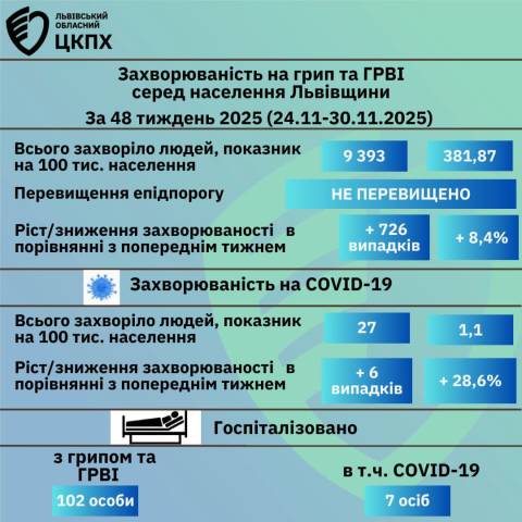 За минулий тиждень, з 24 до 30 листопада, на грип та ГРВІ в області захворіли 9 393 осіб, що на 726 випадків або на 8,4% більше, ніж за попередній тиждень (тоді захворіли 8 667 осіб).