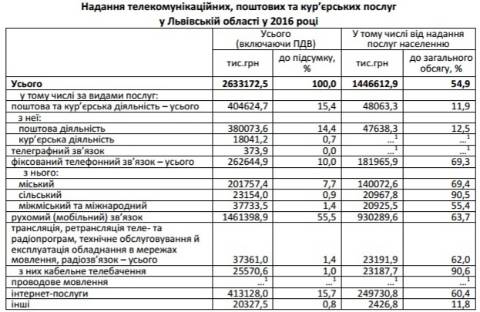 Зокрема, підприємства Львівщини у 2016 році надали споживачам телекомунікаційних, поштових та кур’єрських послуг на 2633,2 млн грн, що на 4,3% більше, ніж у 2015 році.