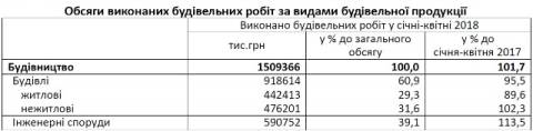 Натомість, порівняно з січнем-квітнем 2017 року, скоротились на 10,4% обсяги робіт на будівництві житла.