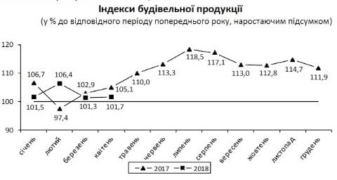 Відтак, індекс будівельної продукції у січні-квітні 2018 року становив 101,7%, порівняно з цими місяцями 2017 року.