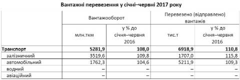 Вантажооборот підприємств транспорту у січні-червні становив 5281,9 млн.ткм і, порівняно з січнем-червнем минулого року, збільшився на 8%. Усіма видами транспорту було перевезено 6918,9 тис.т вантажів, що на 10,8% більше обсягу 2016 року.