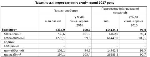 Зокрема, залізниця відправила 6,2 млн пасажирів, що на 6,7% менше, ніж у січні-червні 2016 року, а послугами автомобільного транспорту скористалися 66,4 млн пасажирів, що на 0,1% більше, ніж з початку минулого року.