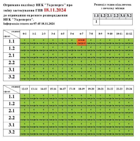 "Отримано вказівку НЕК "Укренерго" про відміну застосування ГПВ на 18.11.2024 до окремого розпорядження НЕК "Укренерго". У випадку нового розпорядження про застосування погодинних відключень, графік буде опубліковано додатково" – йдеться у повідомленні.