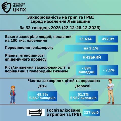 За минулий тиждень, з 22 до 28 грудня, на грип та ГРВІ в області захворіли 11 634 особи, що на 894 випадки або на 7,1% менше, ніж за попередній тиждень (тоді захворіли 12 528 осіб).