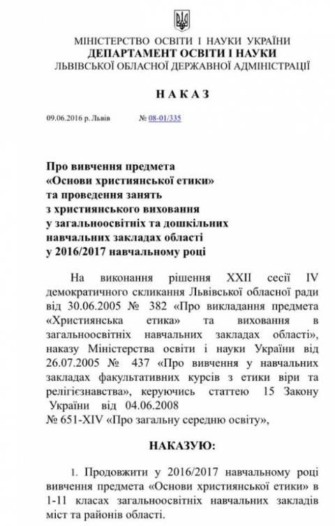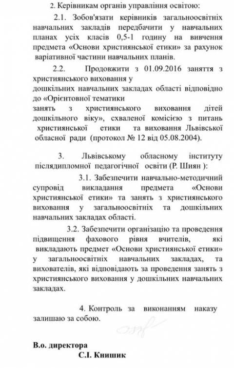 "Зобов'язати керівників загальноосвітніх навчальних закладів передбачити у навчальних планах усіх класів 0,5-1 годину на вивчення предмета "Основи християнської етики" за рахунок варіативної частини навчальних планів", – йдеться у документі.