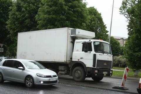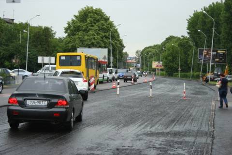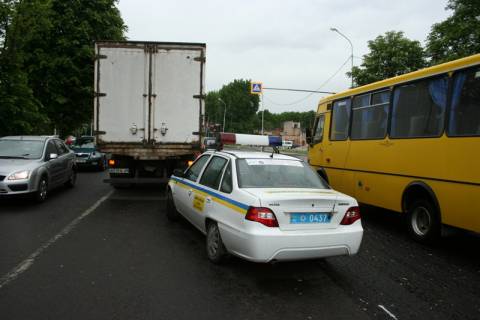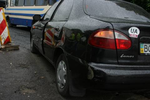 Сьогодні на вулиці Липинського, де відбувається ремонт дорожнього полотна не розминувся автомобіль Deawoo Lanos та вантажівка МАЗ.