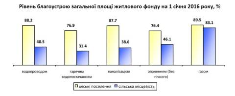 Рівень обладнання площі житла становив: водопроводом – 66,3%, гарячим водопостачанням – 56% каналізацією – 65,2%, опаленням (без урахування пічного) – 62,5%, газом – 86,5%.