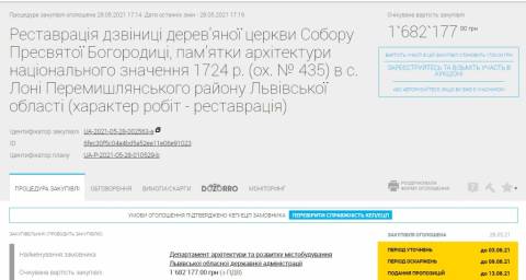 Як вказано у закупівлі, у дзвіниці храму відновлять дерев'яні конструкції 1-го та 2-ого ярусів, сходи і дах, встановлять захист від блискавок, пофарбують.