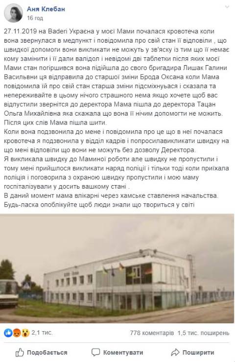 "Коли вона звернулася в медпункт і повідомила про свій стан її відповіли , що швидкої допомоги вони викликати не можуть у зв'яску із тим що її немає кому замінити і її дали валідол і невідомі дві таблетки після яких моєї Мами стан погіршився. Вона підійшла до свого бригадира Лишак Галини Васильвни ця відправила до старшої зміни Брода Оксана. Коли Мама повідомила їй про свій стан старша зміни підсміхнуьася і сказала та непереживайте в цьому нічого страшного нема, якщо хочете щоб вас відпустили звернітся до деректора. Мама пішла до деректора Тацан Ольга Михайлівна яка сказала що вона її нічим допомогти не може" – написала Аня Клебан.