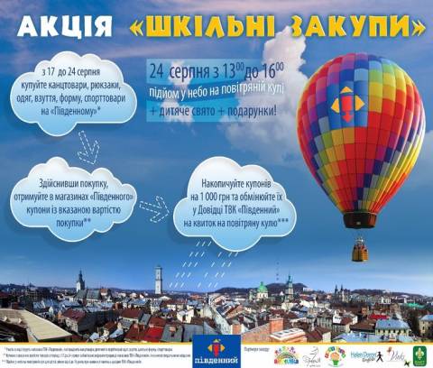 Квиток для підйому дитини у небо на повітряній кулі у рамках акції «Шкільні закупи» отримають клієнти «Південного», які з 17 до 24 серпня 2014 року придбають товарів для школярів у магазинах комплексу на суму 1 000 гривень.