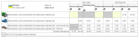 За інформацією польських прикордонників, станом на сьогодні на ранок у двох пунктах пропуску на кордоні з Україною зафіксували черги з вантажівок, зокрема, час очікування на в'їзд в Україну складав від 25 до 77 годин.