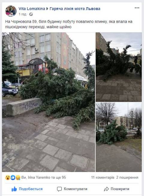 Як вказано у дописі, на проспекті Чорновола біля кільця з вулицею Липинського, гігантська ялинка впала на пішохідну зону.