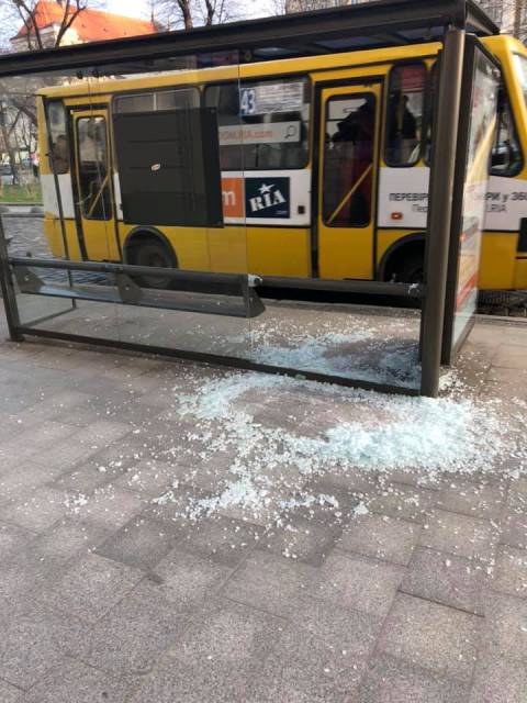 Сьогодні вранці невідомі особи розбили скло на зупинці громадського транспорту у центрі Львова.