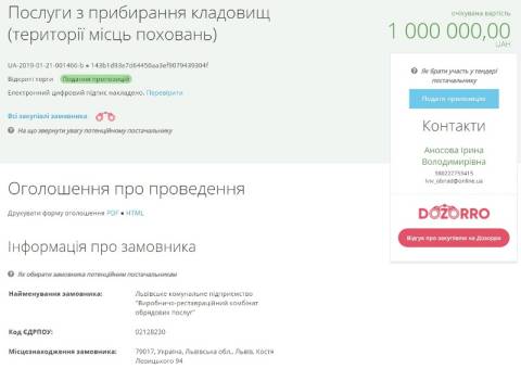 Львівське комунальне підприємство "Виробничо-реставраційний комбінат обрядових послуг" оголосило тендер у системі ProZorro послуги з прибирання кладовищ (території місць поховань), які переможець тендеру має здійснювати до 31 грудня 2019 року.