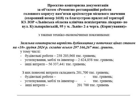 Згідно із проєктом, загальна вартість усіх робіт, станом на 10 грудня 2024 року, становить 297 166 267 грн й складатиметься із таких витрат: