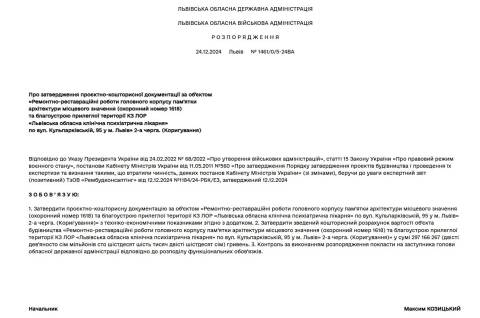 Максим Козицький затвердив проєктно-кошторисну документацію з другої черги ремонтно-реставраційних робіт головного корпусу пам’ятки архітектури місцевого значення та благоустрою прилеглої території КЗ ЛОР "Львівська обласна клінічна психіатрична лікарня", що на вул. Кульпарківській, 95 у Львові, враховуючи експертний звіт ТОВ "Рембудконсалтінг" від 12 грудня 2024 року.