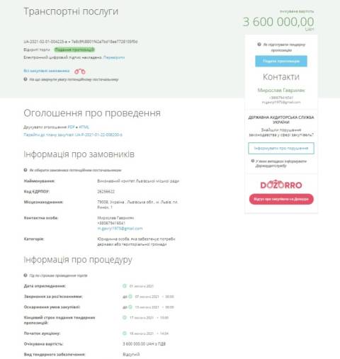 Виконавчий комітет Львівської міської ради оголосив тендер у системі ProZorro на транспортні послуги – послуги таксі, які переможець тендеру має постачати міськраді до 31 грудня 2021 року.